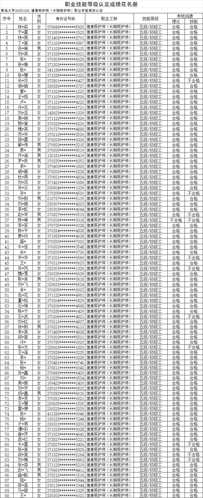 青岛大学长期照护师(五级)职业技能等级认定,现公示认定考试成绩。公示期为5个工作日,自2025年12月23日至2025年12月29日(不含节假日)。公示期间,如对成绩有异议,请联系青岛大学医学教育培训中心。